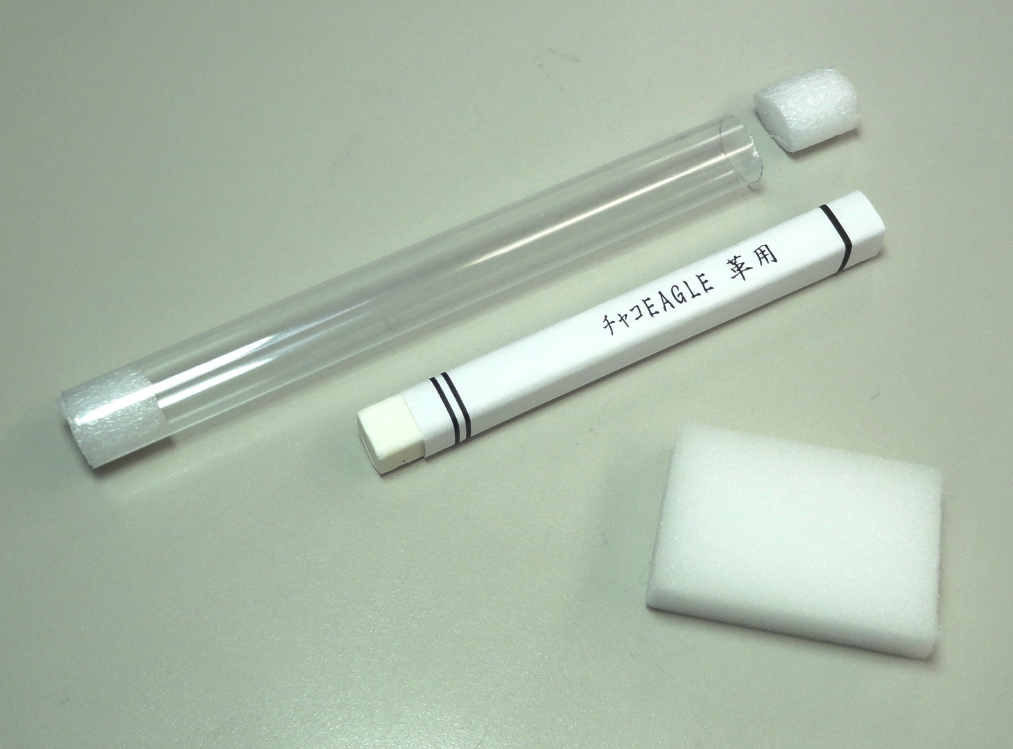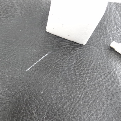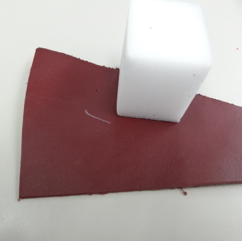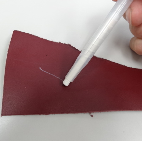 革に軽く書いて 消すときは付属のスポンジでこするだけですっきり消えます。