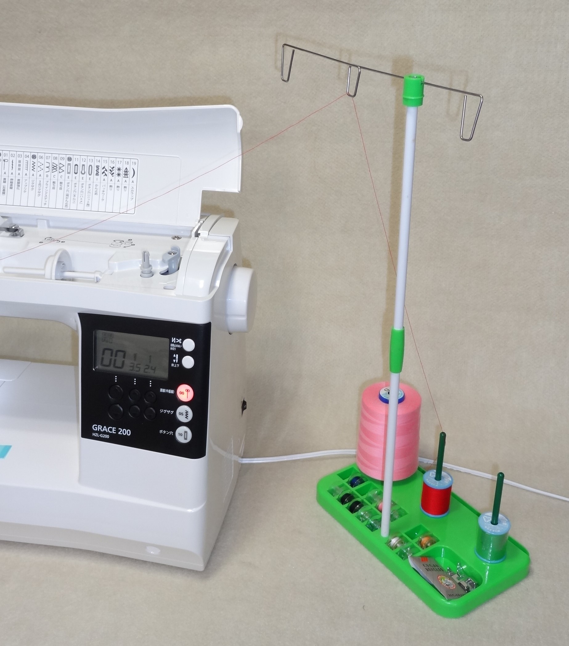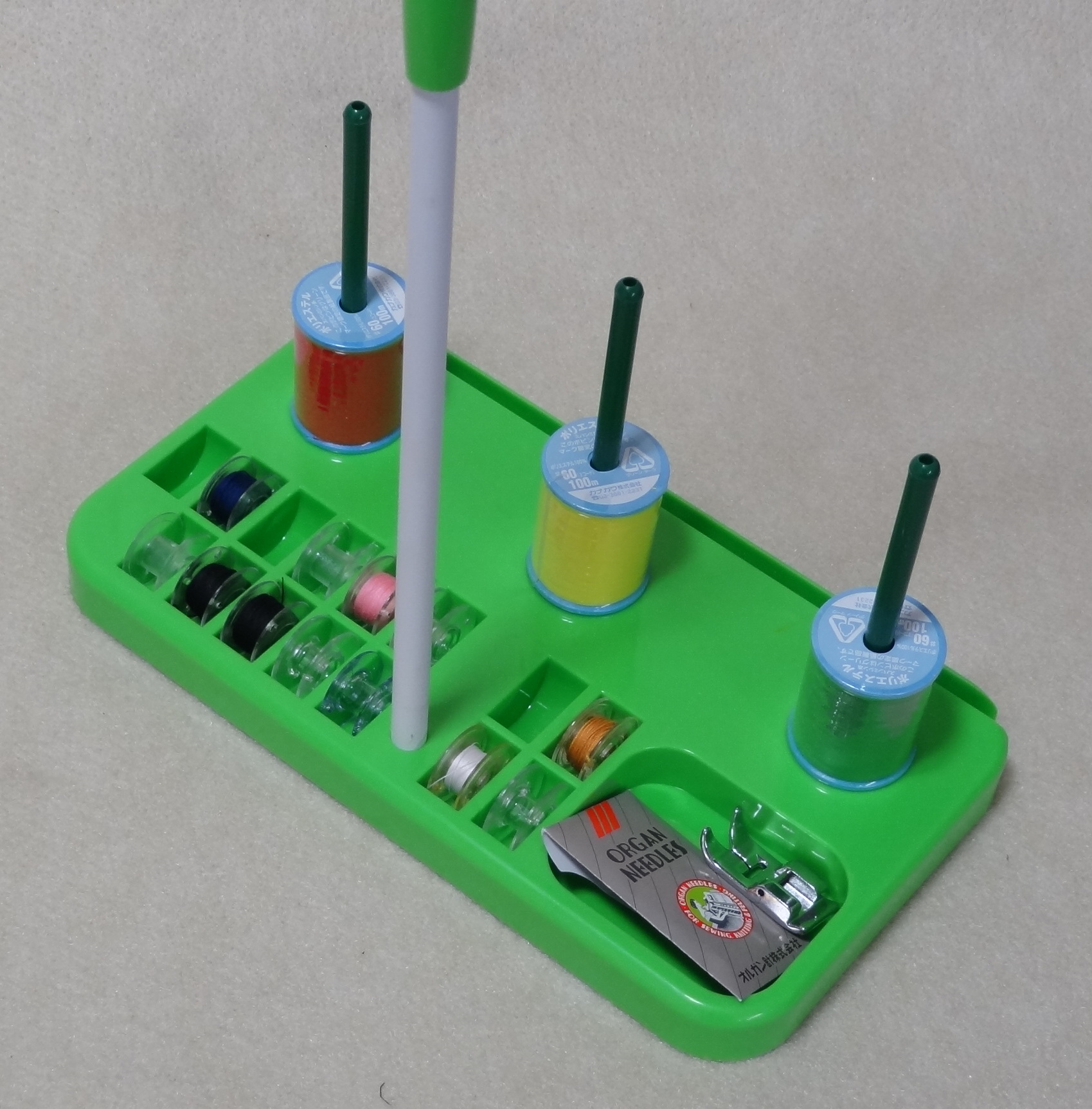 糸が3本立てられる以外に、ボビンや小物も置くことができます。