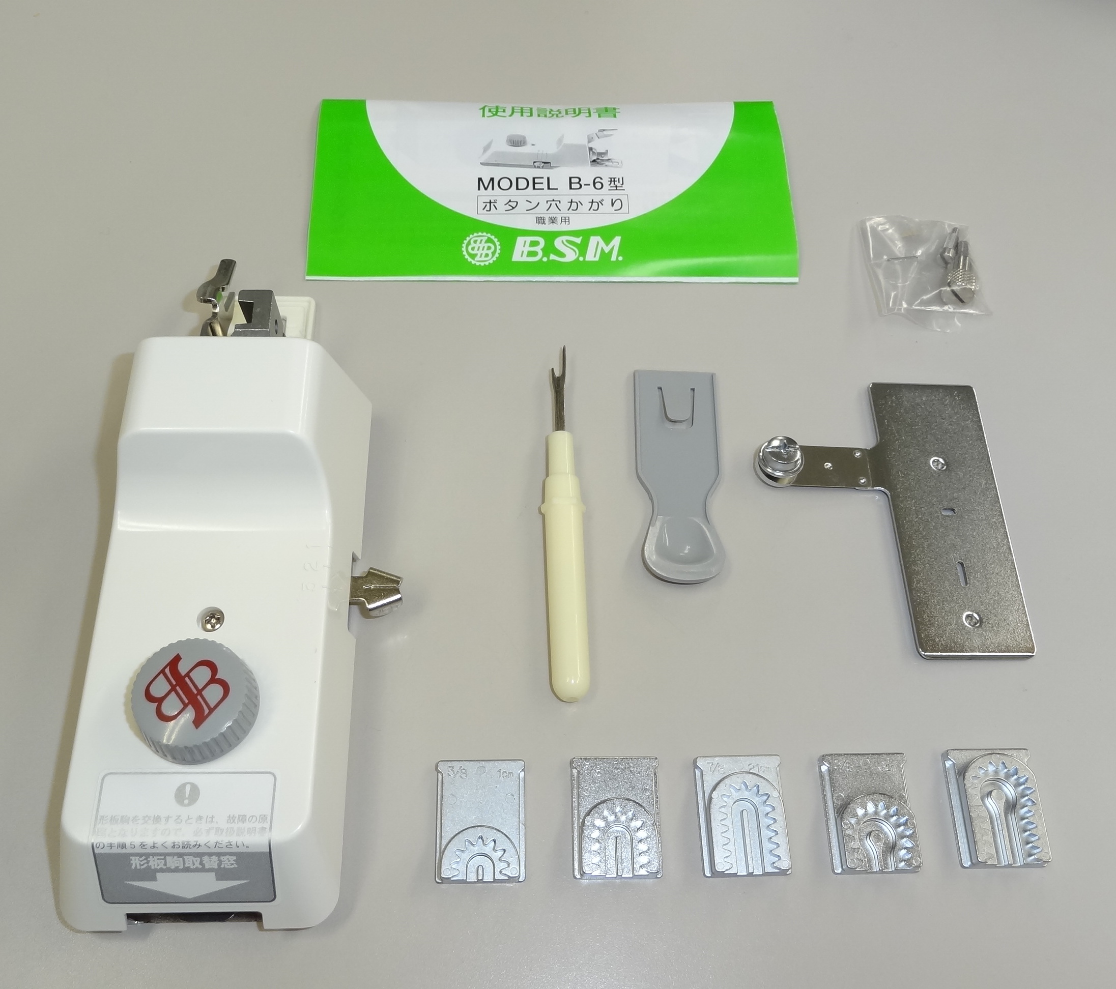 本体と駒以外に針板カバー(ミシンの送りバをカバーする板です)と 本体固定ネジと 駒抜き板と リッパー(ボタンホールの間の生地を切るもの)と 説明書が本体部品を収納する専用プラスチックケースが付いております。