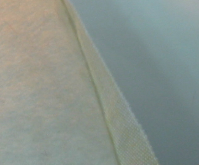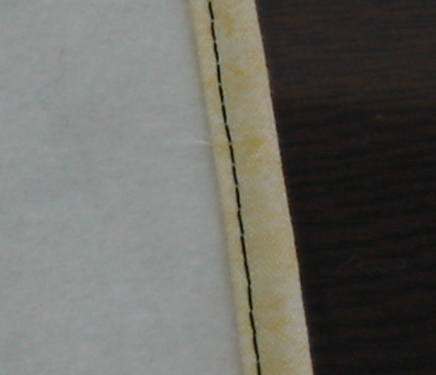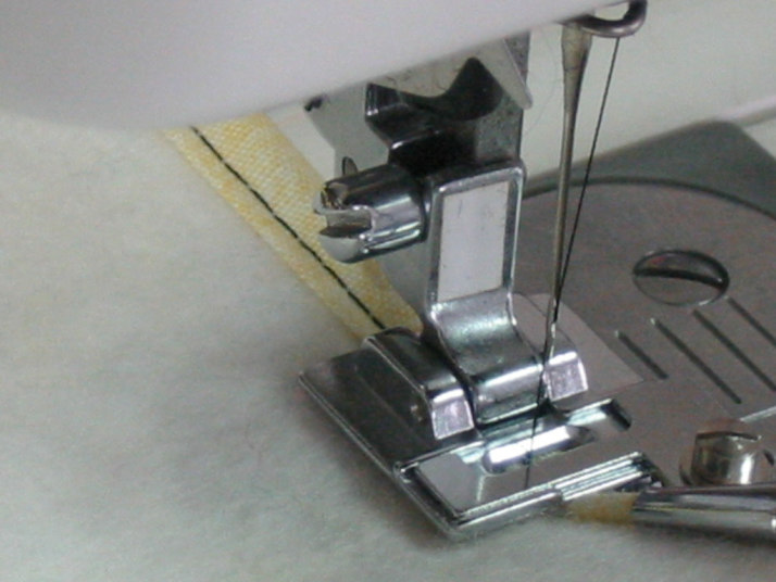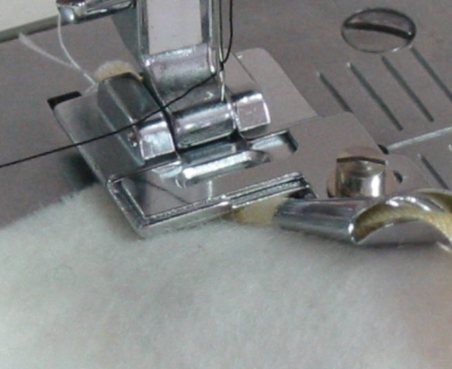 ここまで来れば あとはミシンをゆっくり動かして縫っていきます。 縫っているときテープで生地をはさんで生地がバインダーの奥まで入るように右側からバインダーに入れて下さい。 |