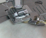ミシンのプーリーを手で回して3〜4針縫って下さい。 その時 身頃をミシンが送るのと一緒に手でも送って下さい。 (まだ 完全にミシンの送り歯に生地が当たっていませんので ミシンだけでは生地が送れません) |