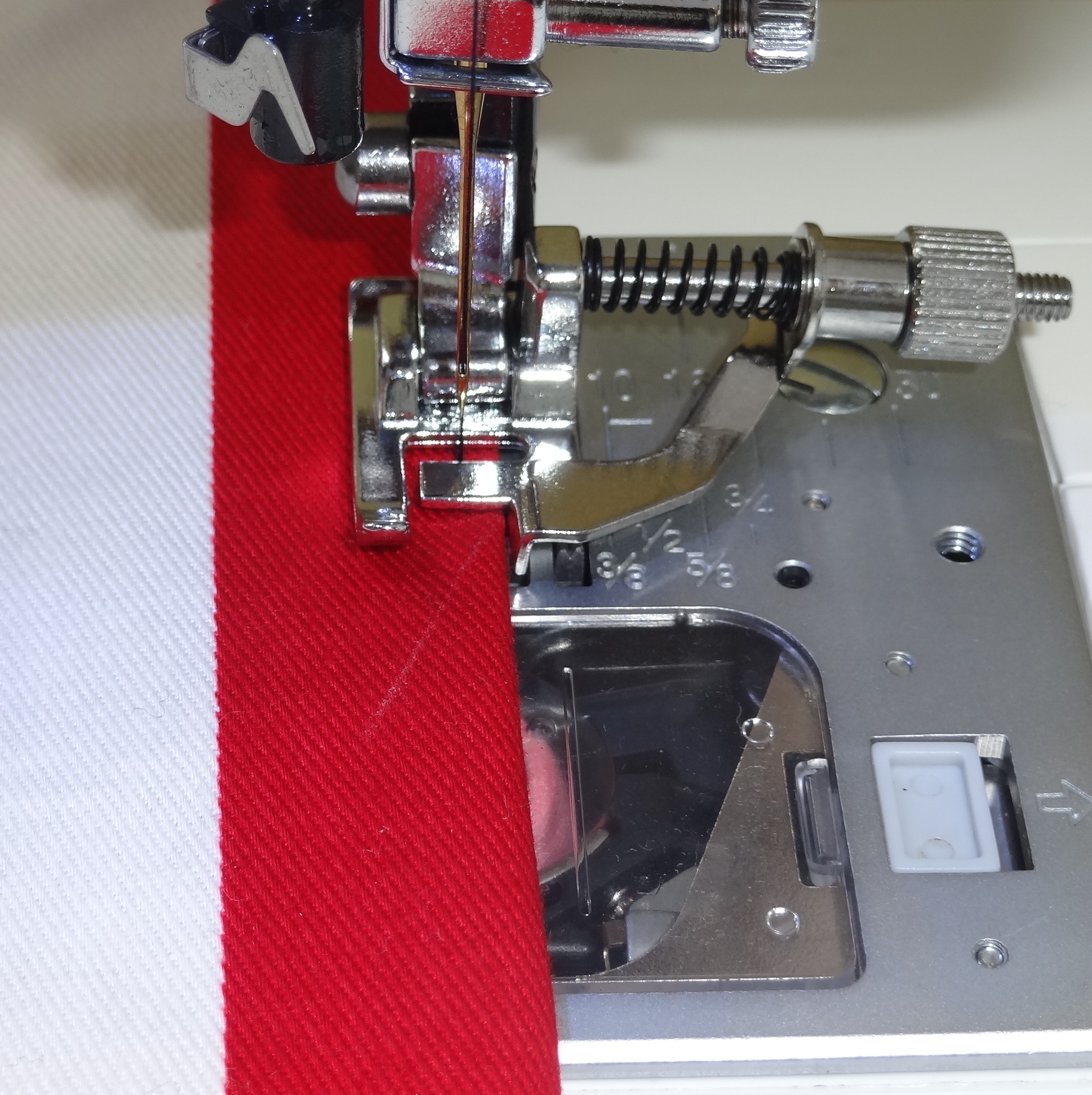 白いプラスチックのガイドに沿って縫っていくことで一定の幅に縫うことができます。