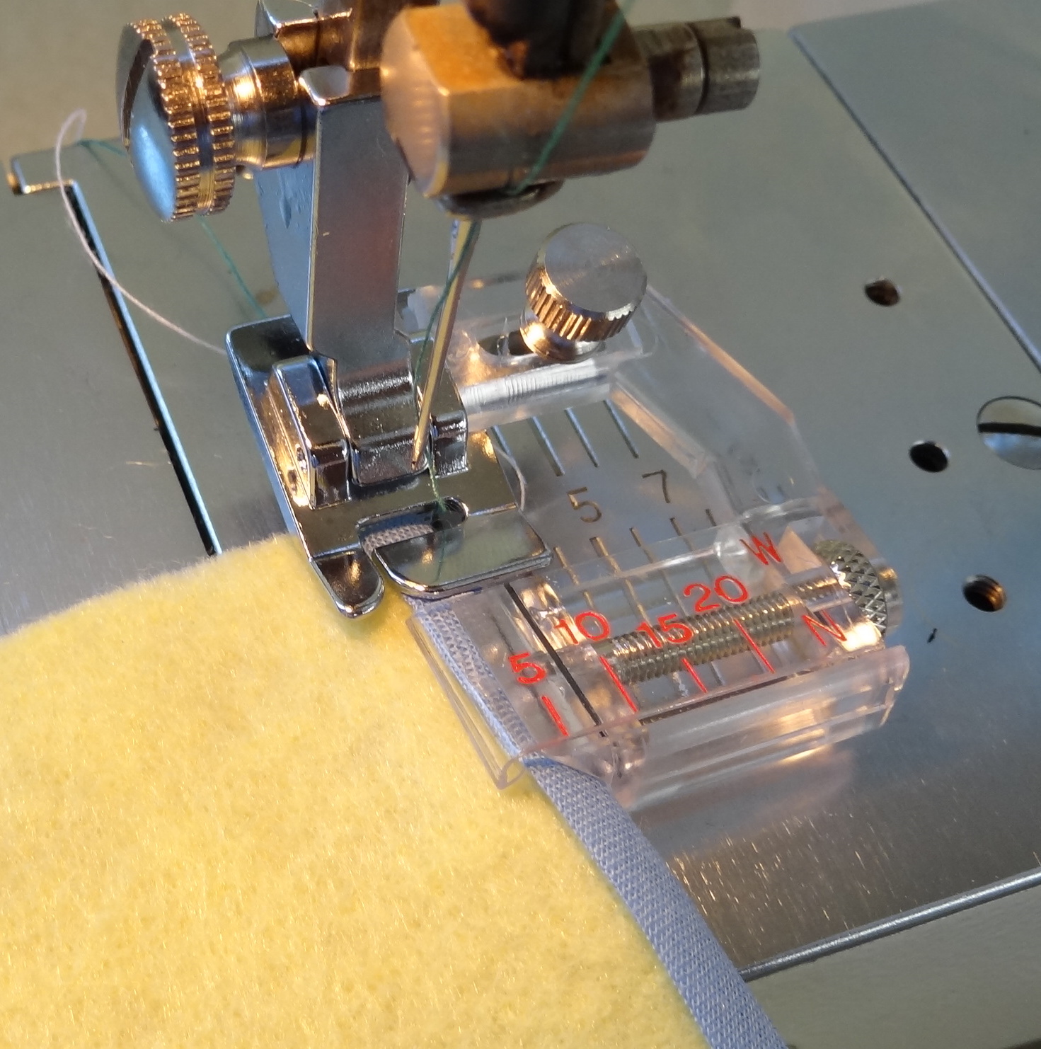この押エを使えば市販されている「バイヤステープ」で縁取りができます。